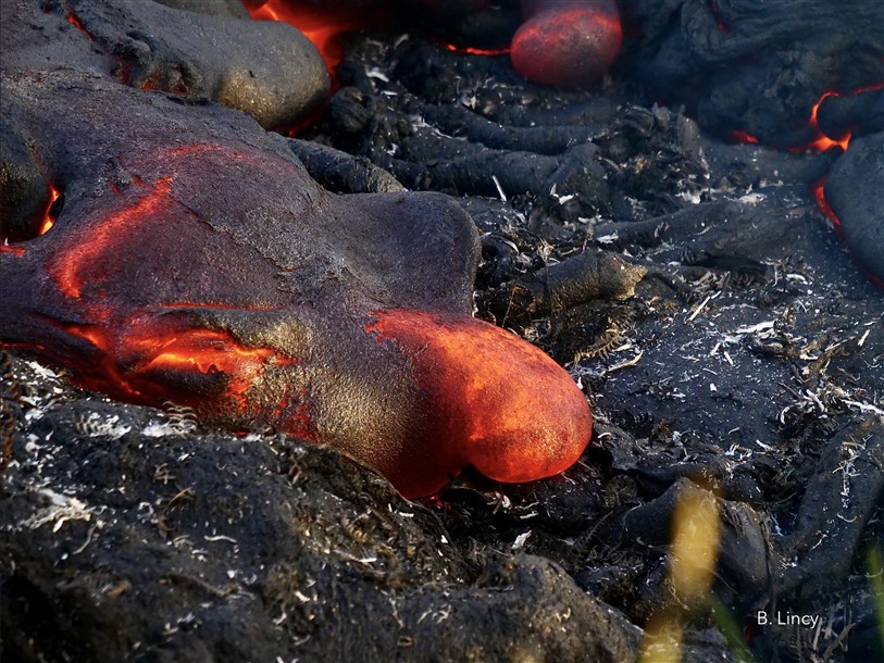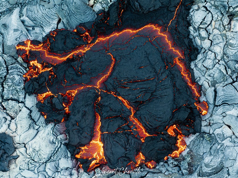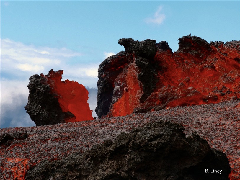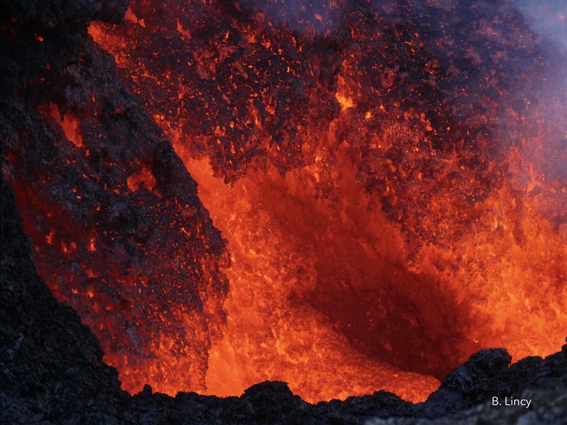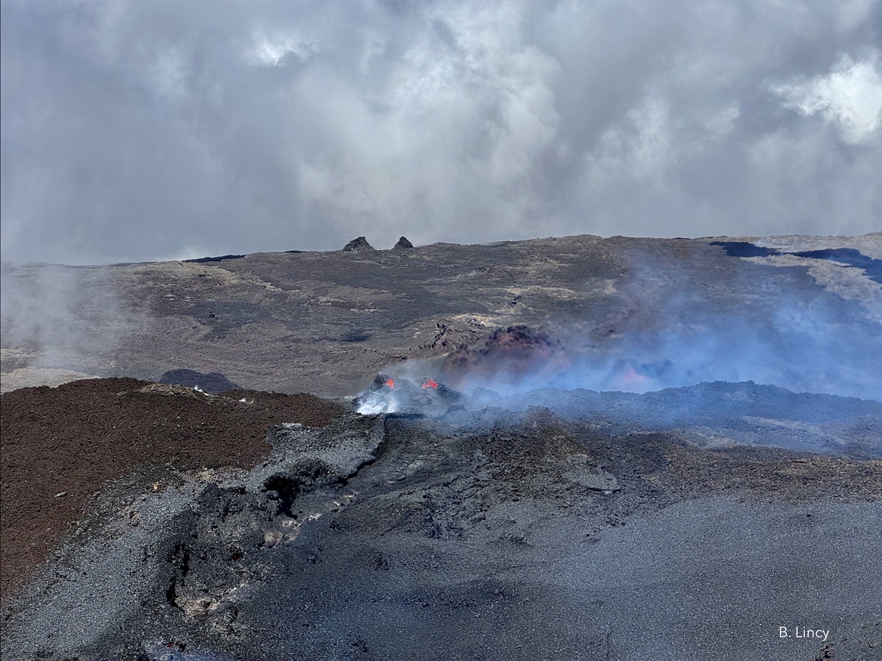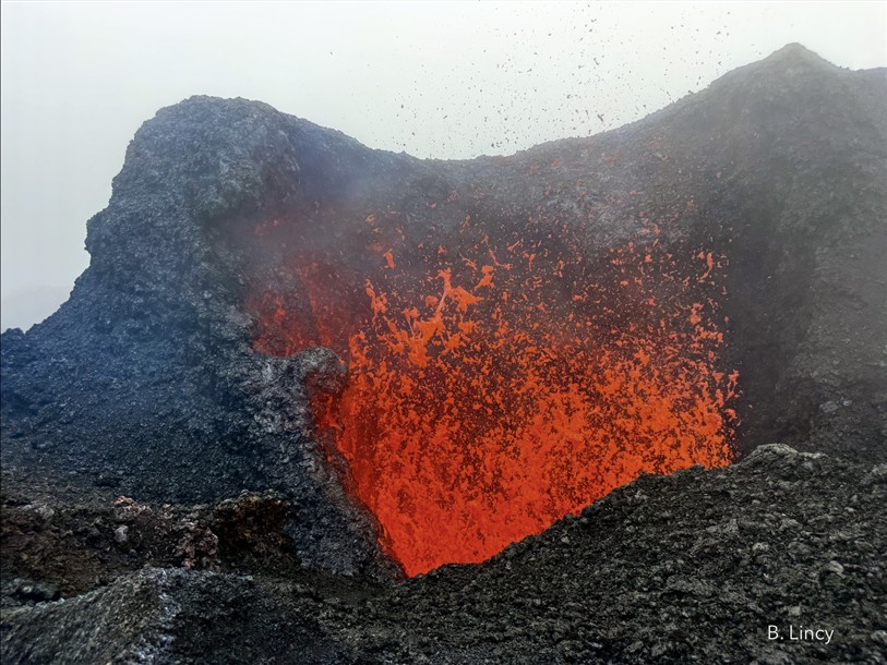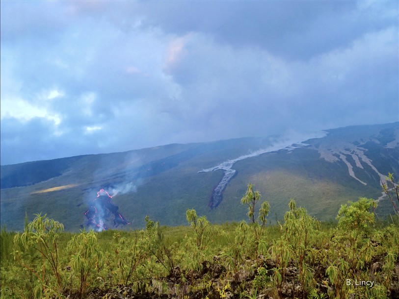 Au niveau du cône, l’activité s’est traduite par des remous de lave, des débordements récurrents et une remontée active de bulles de gaz. En aval, de nombreuses résurgences ont été observées sur le champ de lave déjà mis en place entre le 13 février et le 25 mars.