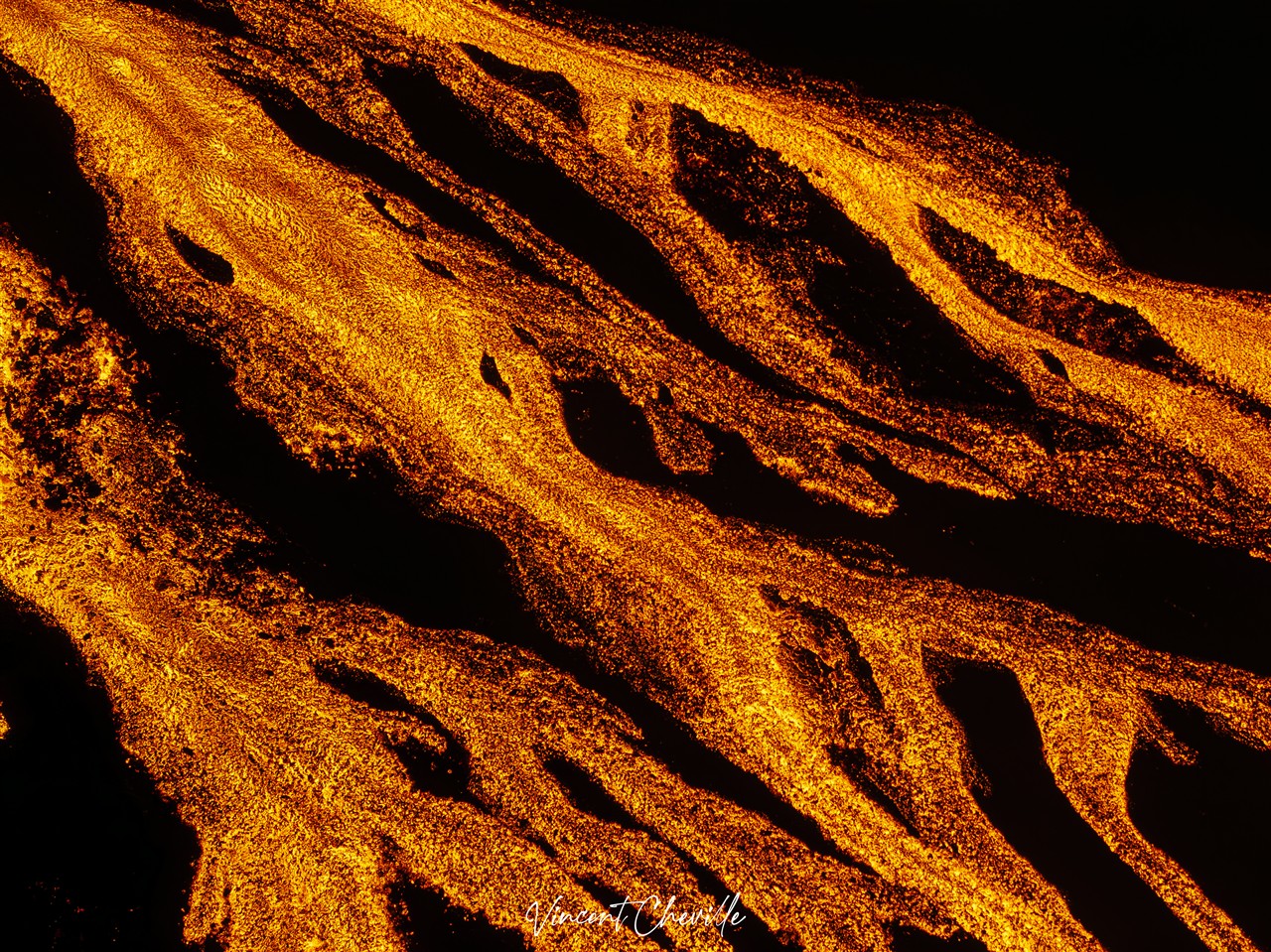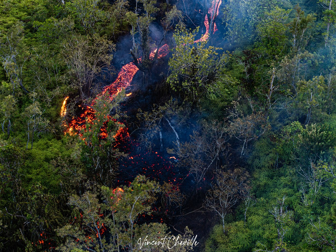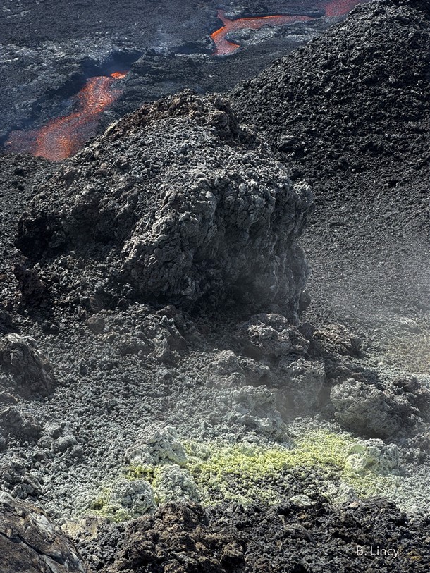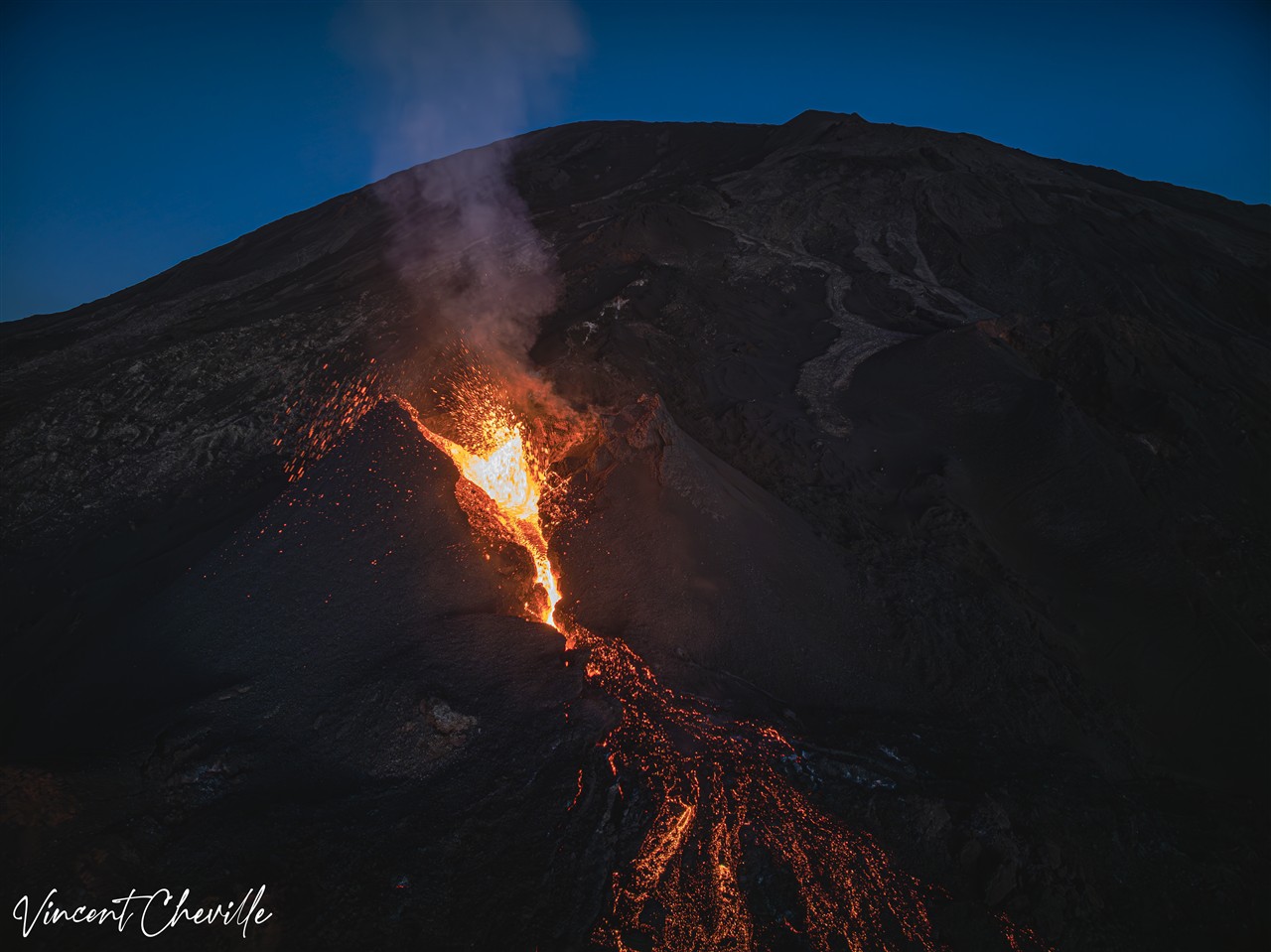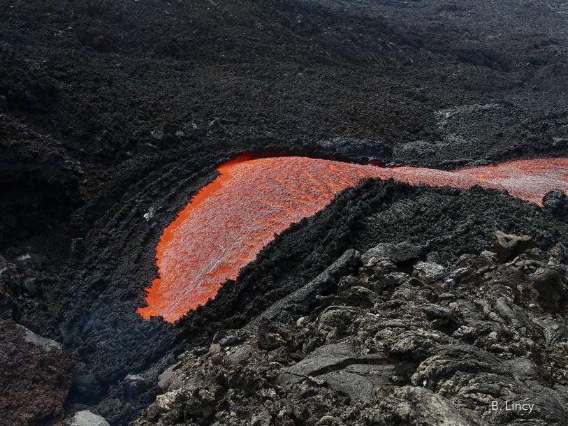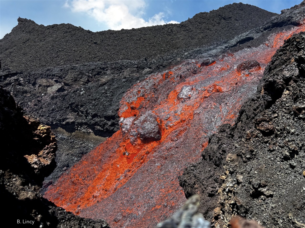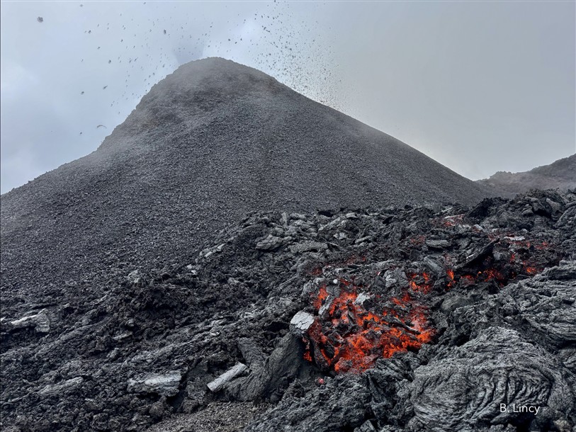 Cette reprise s’est faite au niveau du cône déjà en place, sans ouverture d’une nouvelle fissure distincte. Les observations montrent que la lave a réemprunté le réseau de tunnels installé au cours des semaines précédentes. C’est précisément ce qui explique la rapidité de la réactivation en aval : une partie du trajet était déjà en place, ce qui a permis à la lave de progresser beaucoup plus vite vers le bas du massif.