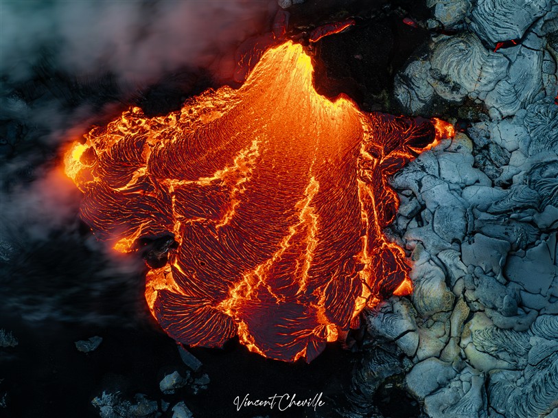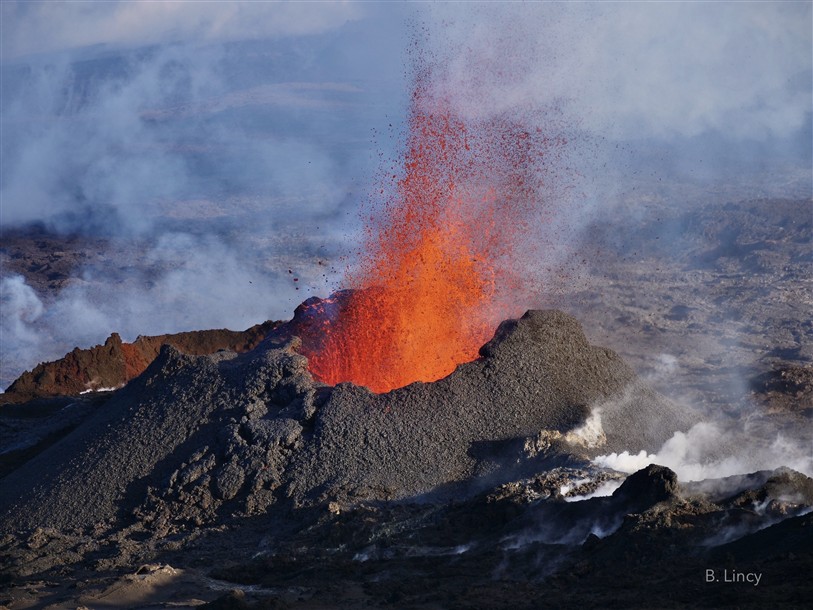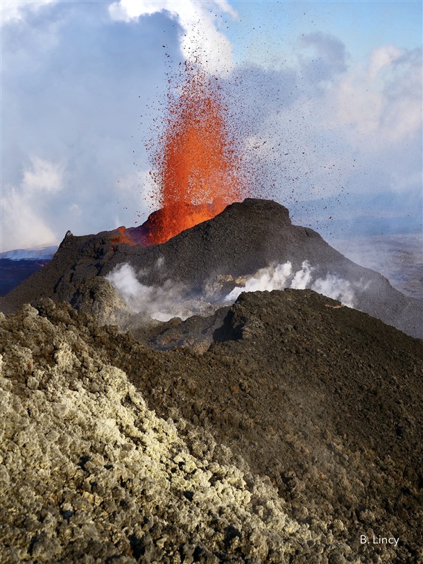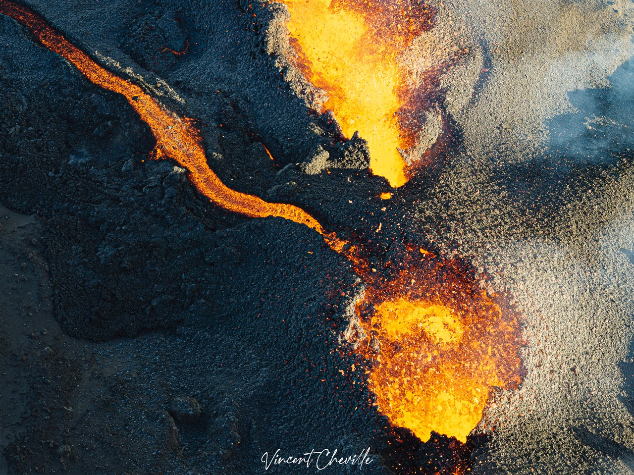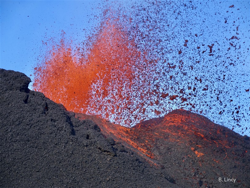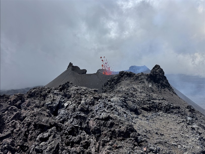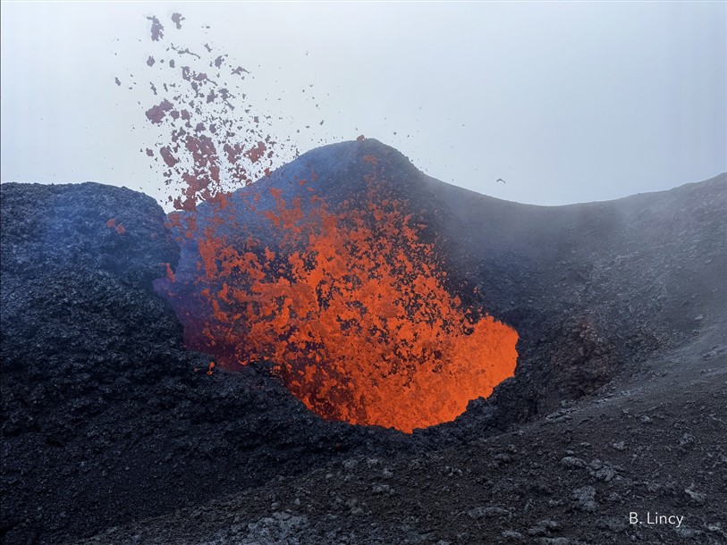 Quatre fissures s’ouvrent dans les premières heures. La phase initiale est énergique, avec plusieurs points d’émission, des fontaines de lave et des coulées qui s’engagent rapidement vers l’aval. Le comportement observé correspond bien à celui d’un volcan basaltique effusif : le magma est fluide, peu visqueux, et peut donc s’écouler efficacement sur les pentes.