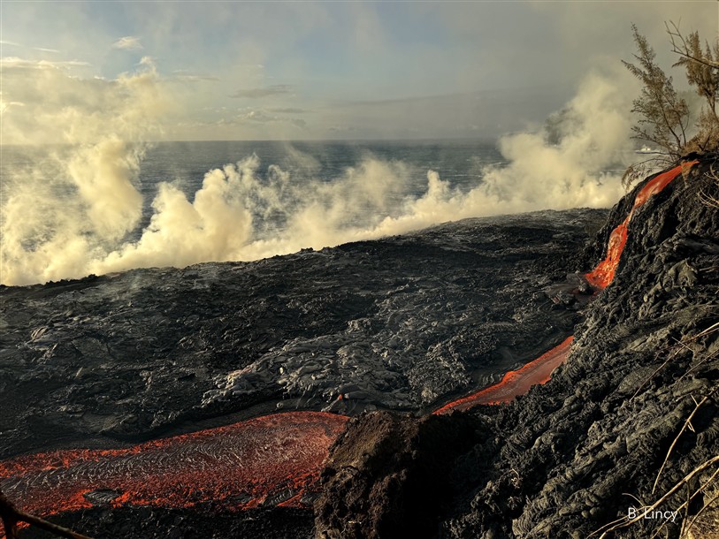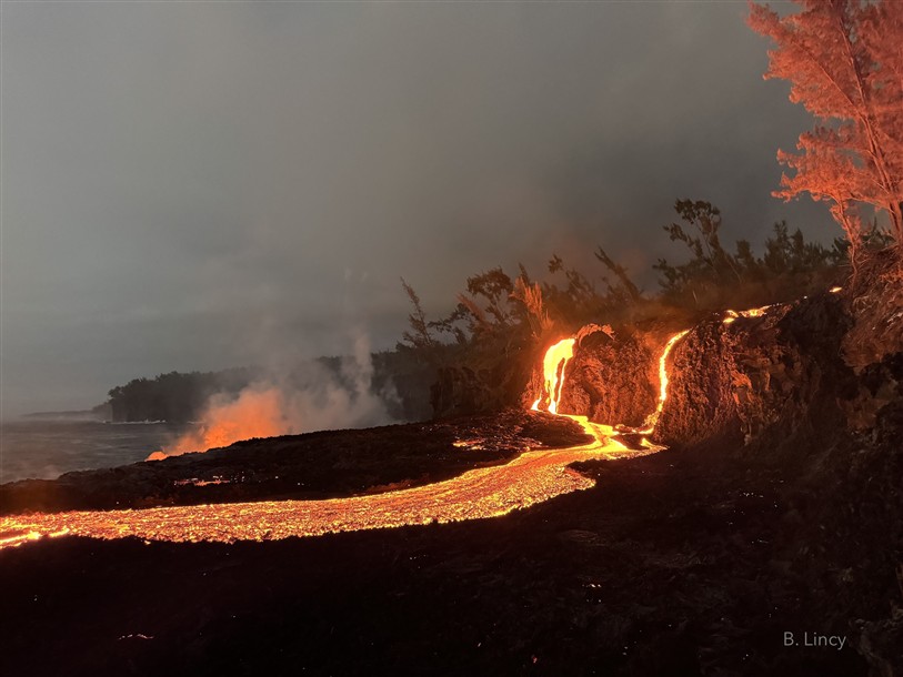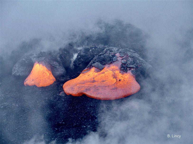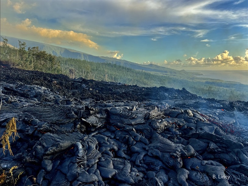Une fois l’entrée en mer établie, l’éruption continue à bas régime mais avec une grande efficacité sur le littoral. Le cône reste actif, mais c’est désormais la plateforme qui attire l’attention. Alimentée par la coulée principale, puis surtout par des circulations en tunnel, elle s’agrandit rapidement.