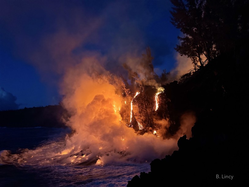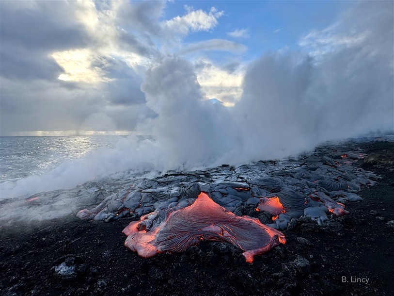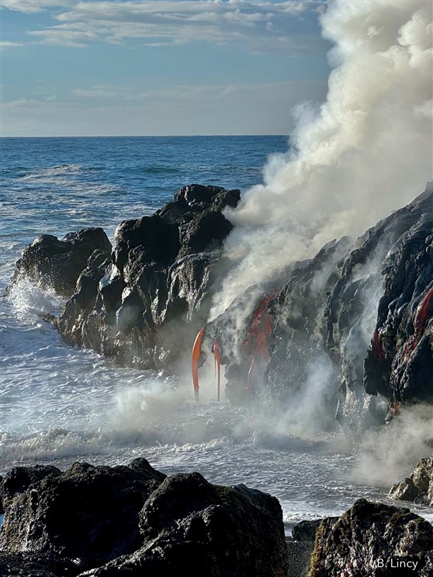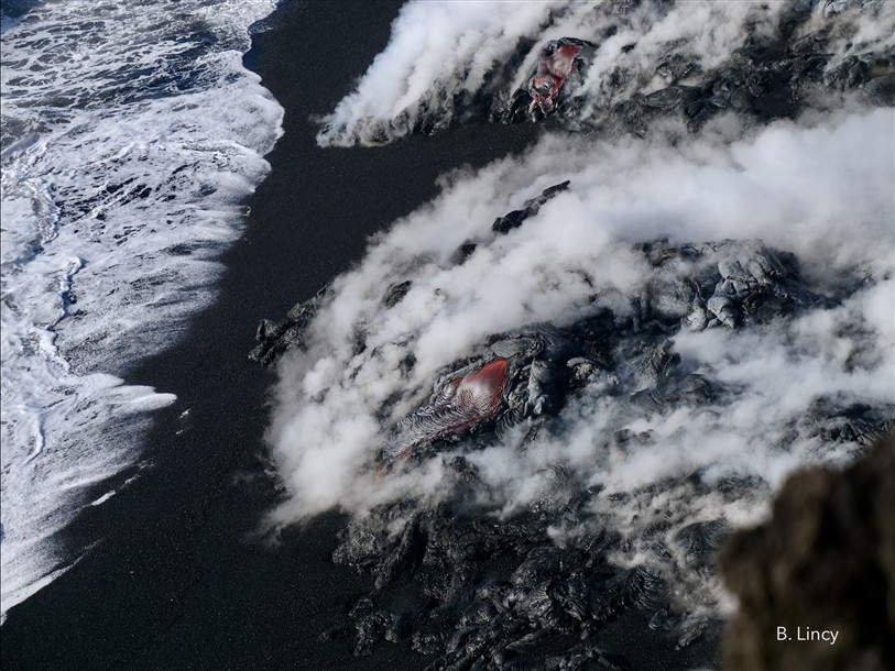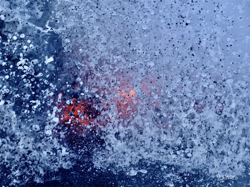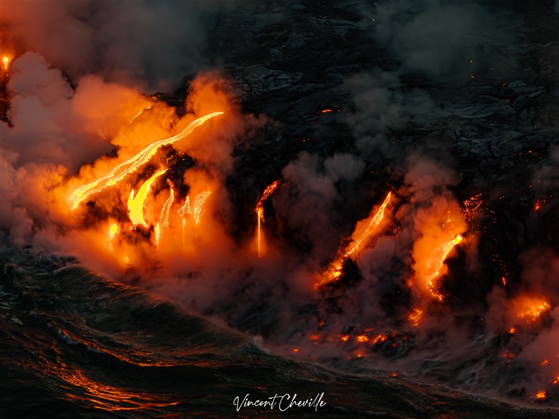 Quelques heures plus tard, le lundi 30 mars, la lave a de nouveau atteint l’océan. Après avoir recoupé la RN2 pendant le week-end, l’écoulement a poursuivi sa progression jusqu’au littoral, offrant une nouvelle rencontre spectaculaire entre la lave et la mer.