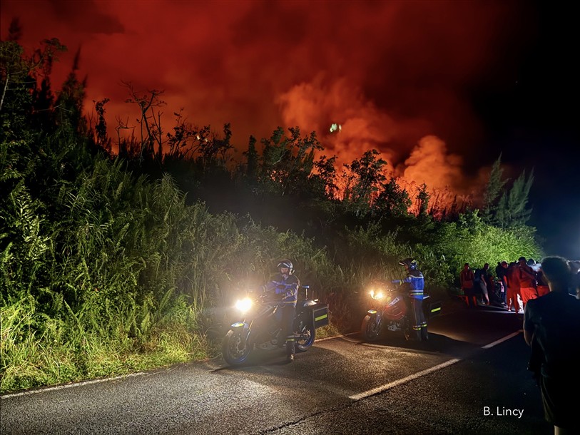 Le 12 mars, la situation devient concrètement critique pour les infrastructures. La lave s’approche de la RN2, grande route côtière du Grand Brûlé. Les autorités ferment alors l’axe par précaution.
