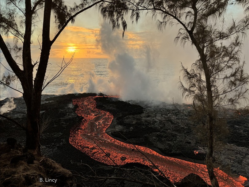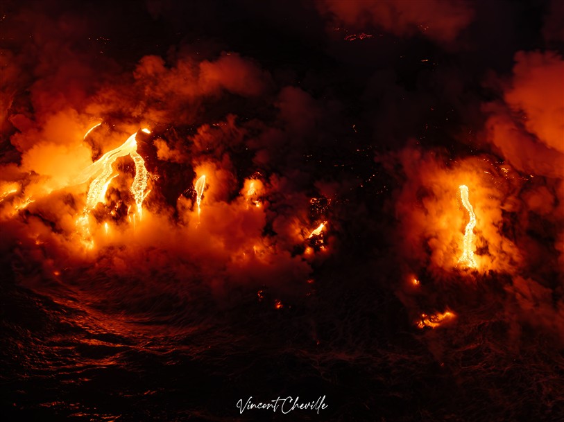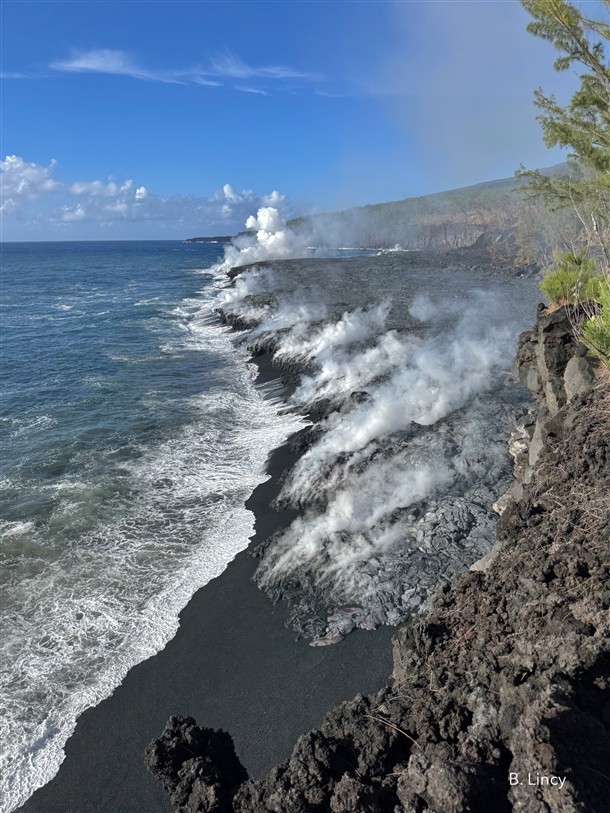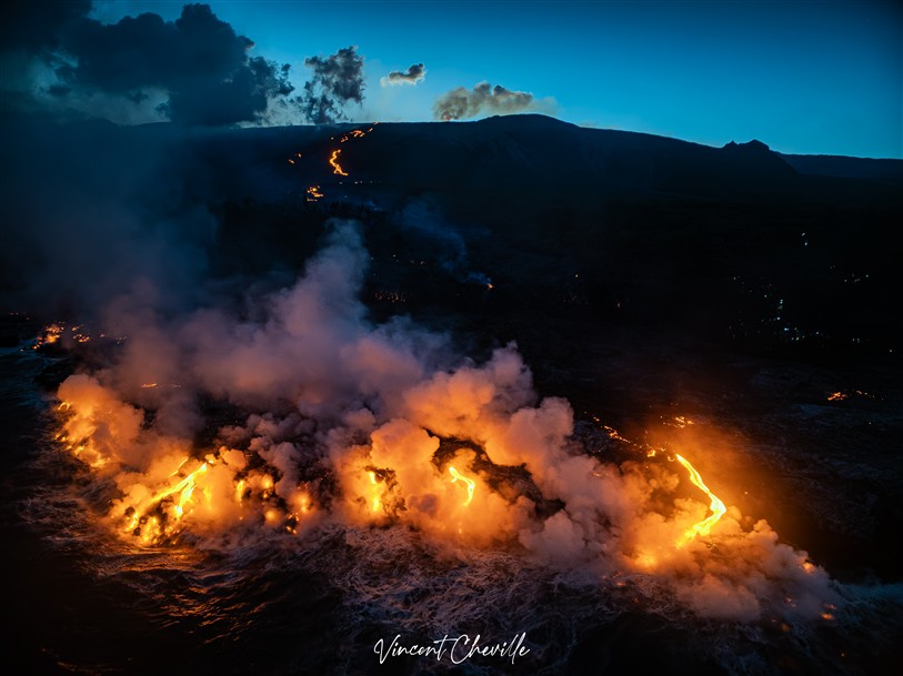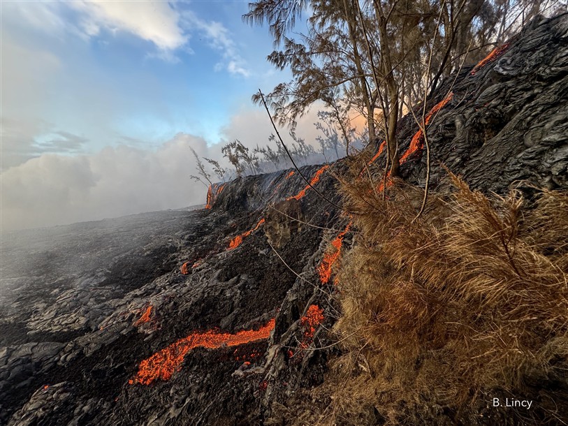 Cette reprise de l’entrée en mer s’est accompagnée d’une réalimentation de la plateforme formée lors de la phase précédente. À ce stade, l’activité au niveau de l’océan restait toutefois à surveiller de près, notamment en raison du panache de gaz pouvant se renforcer au point de contact entre la lave et l’eau.