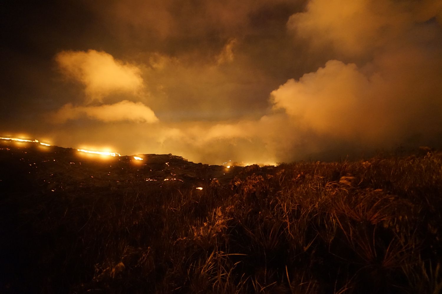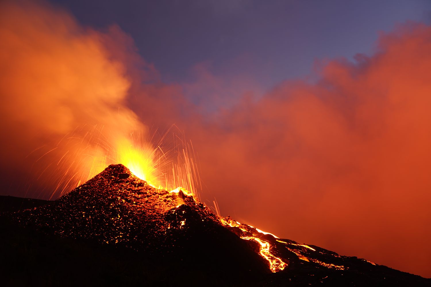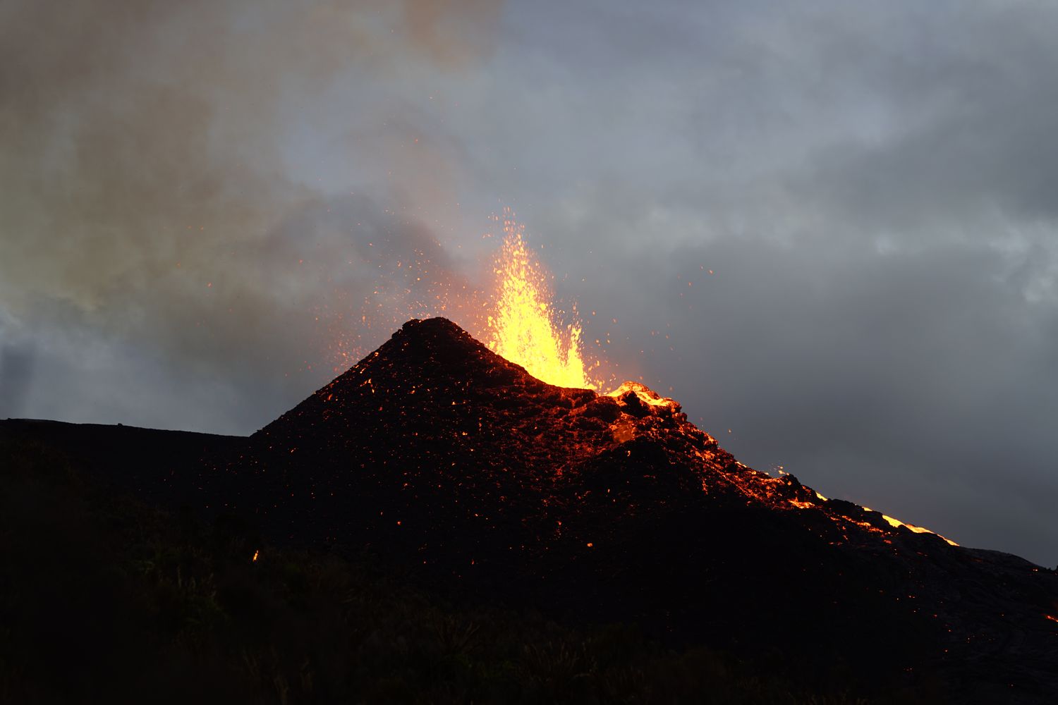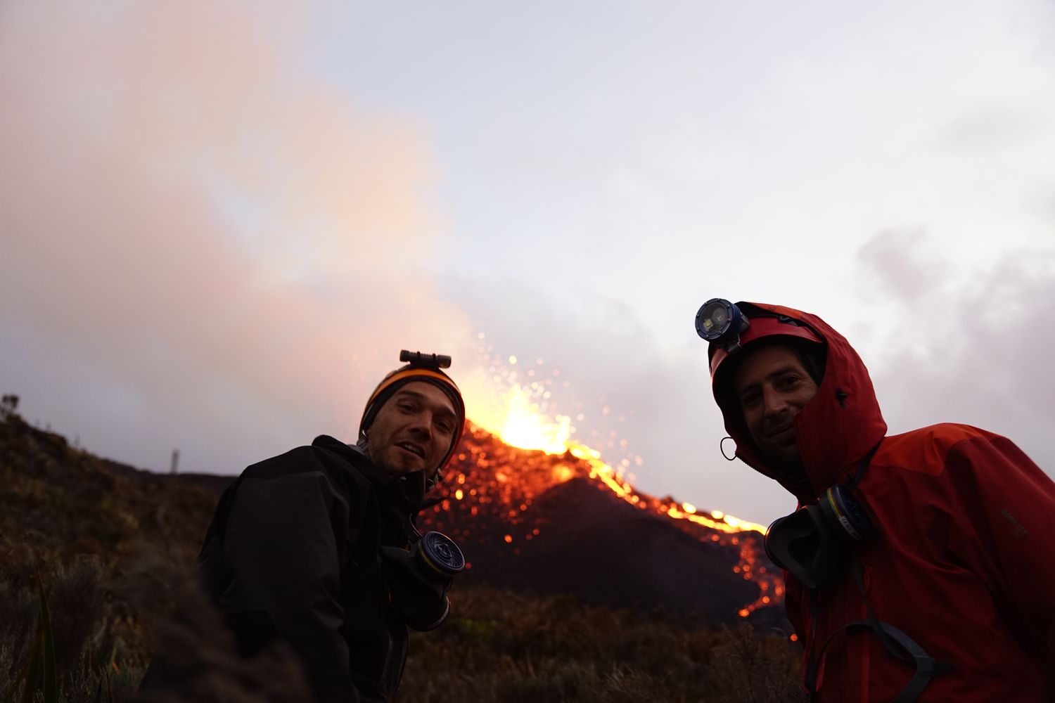 A 22H une petite amélioration des conditions nous décide à continuer notre périple et nous allons passer au final une nuit merveilleuse bien au chaud proche des coulées de lave et des 3 petits cratères en formation