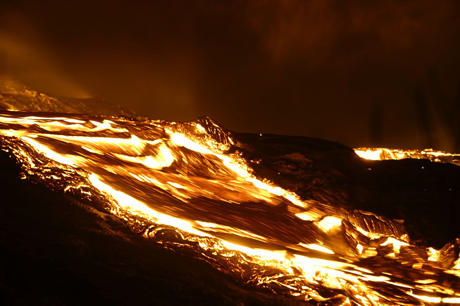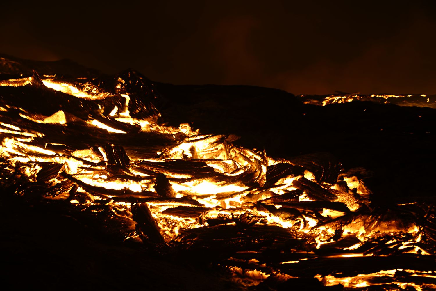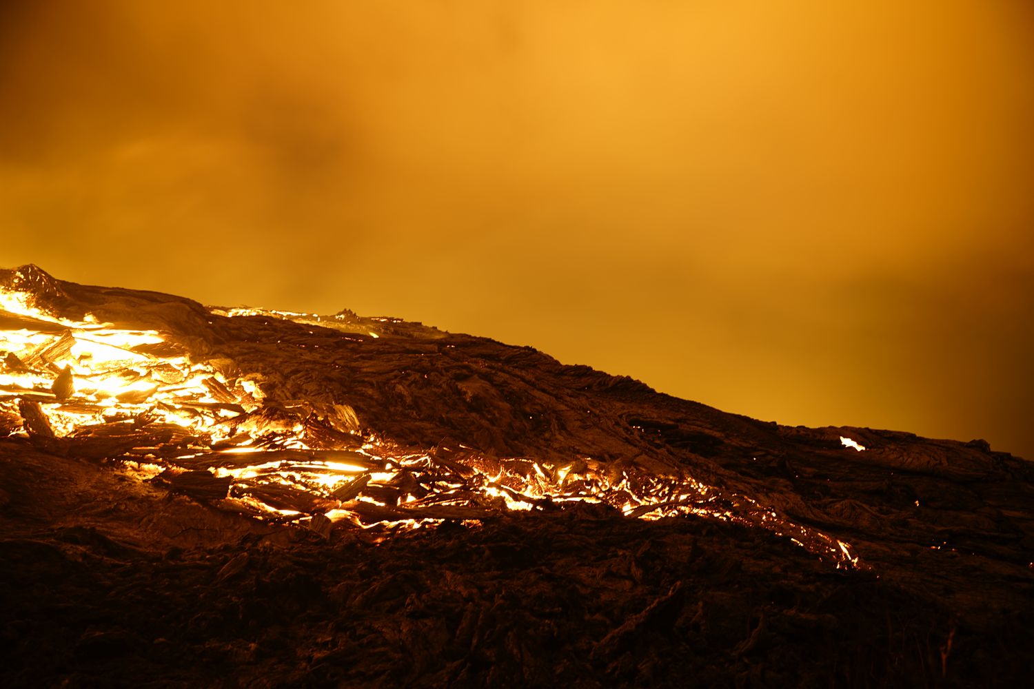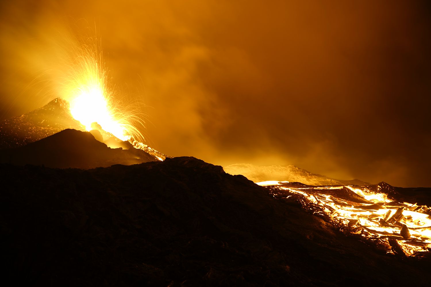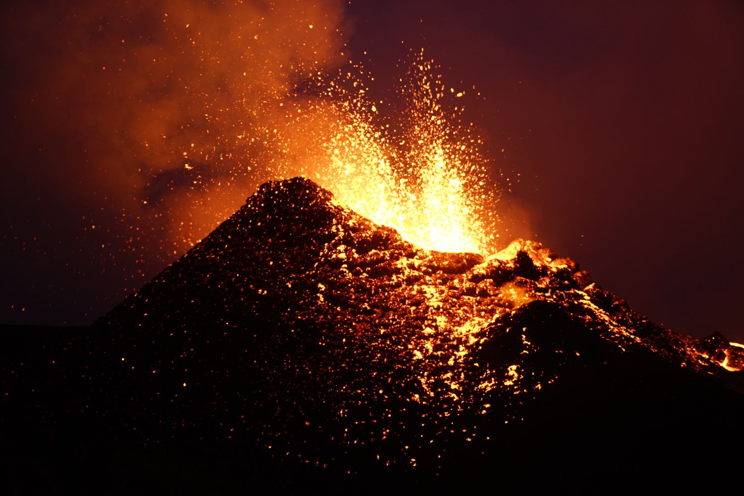 A 22H une petite amélioration des conditions nous décide à continuer notre périple et nous allons passer au final une nuit merveilleuse bien au chaud proche des coulées de lave et des 3 petits cratères en formation
